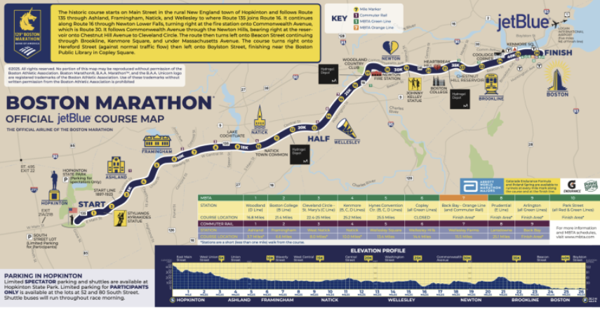 도시 중심인 코플리 스퀘어로 도착하는 코스로 이 마라톤의 특이점은 기록을 제출해야 참여할 수 있다.
