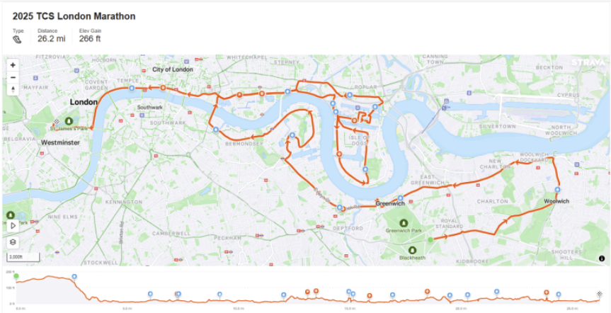 템스강을 따라 달리며 마지막에는 버킹엄 궁전에서 골인을 하게 되는 코스로 되어있다.